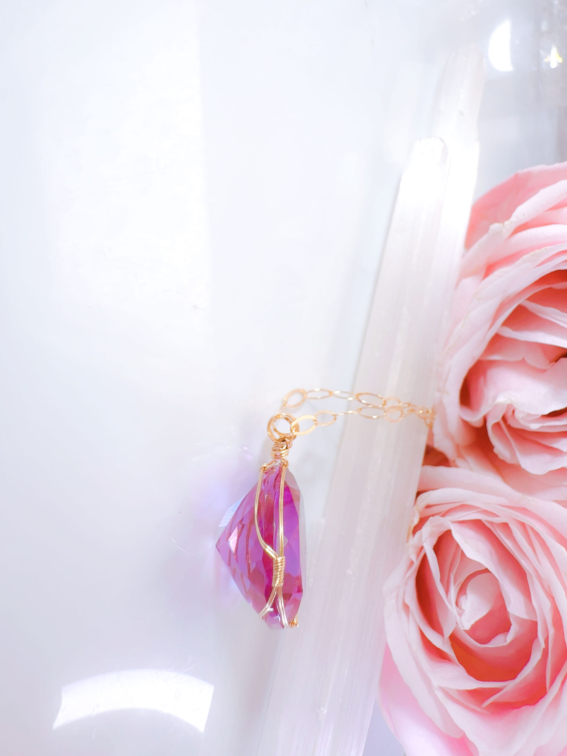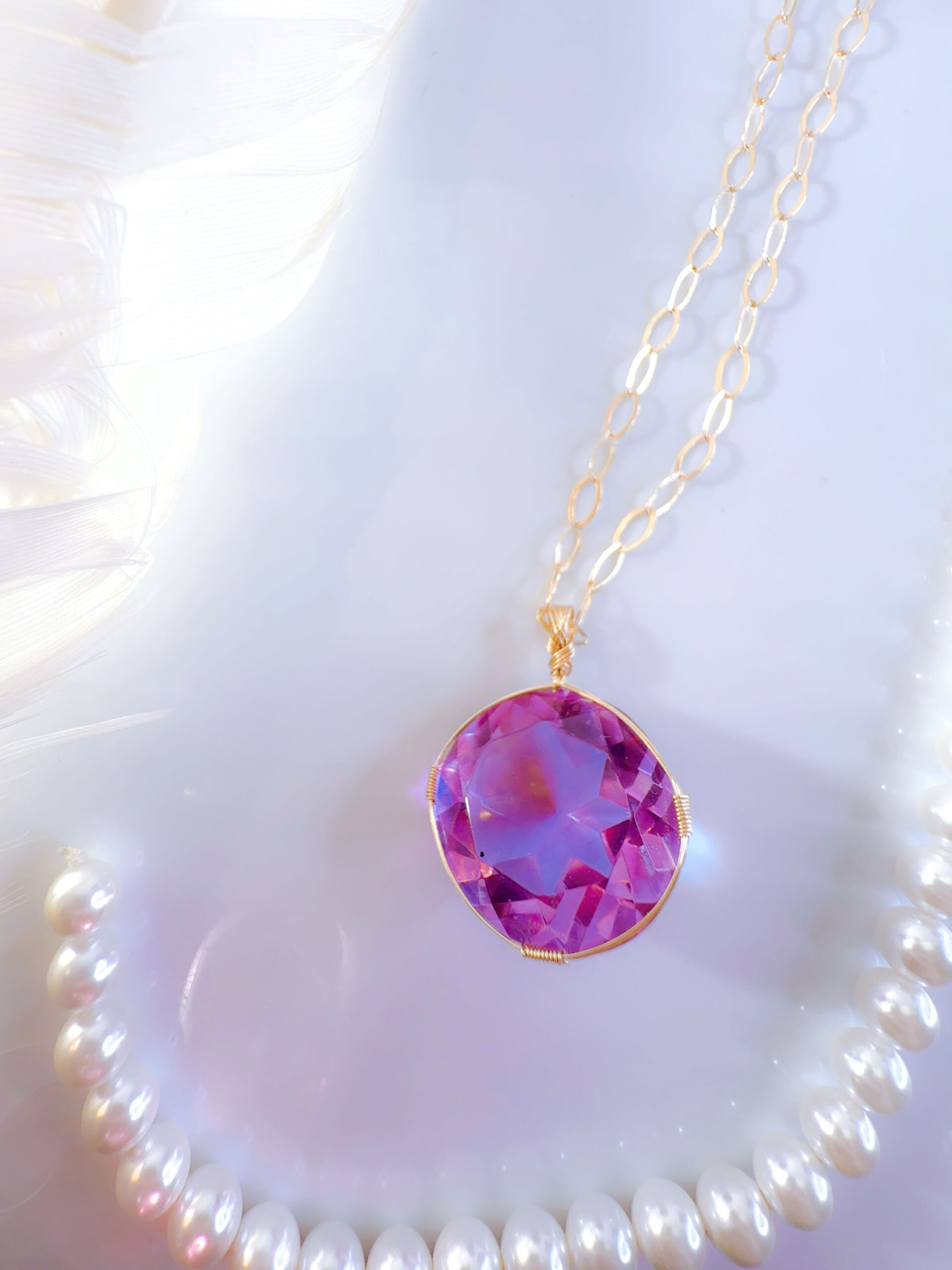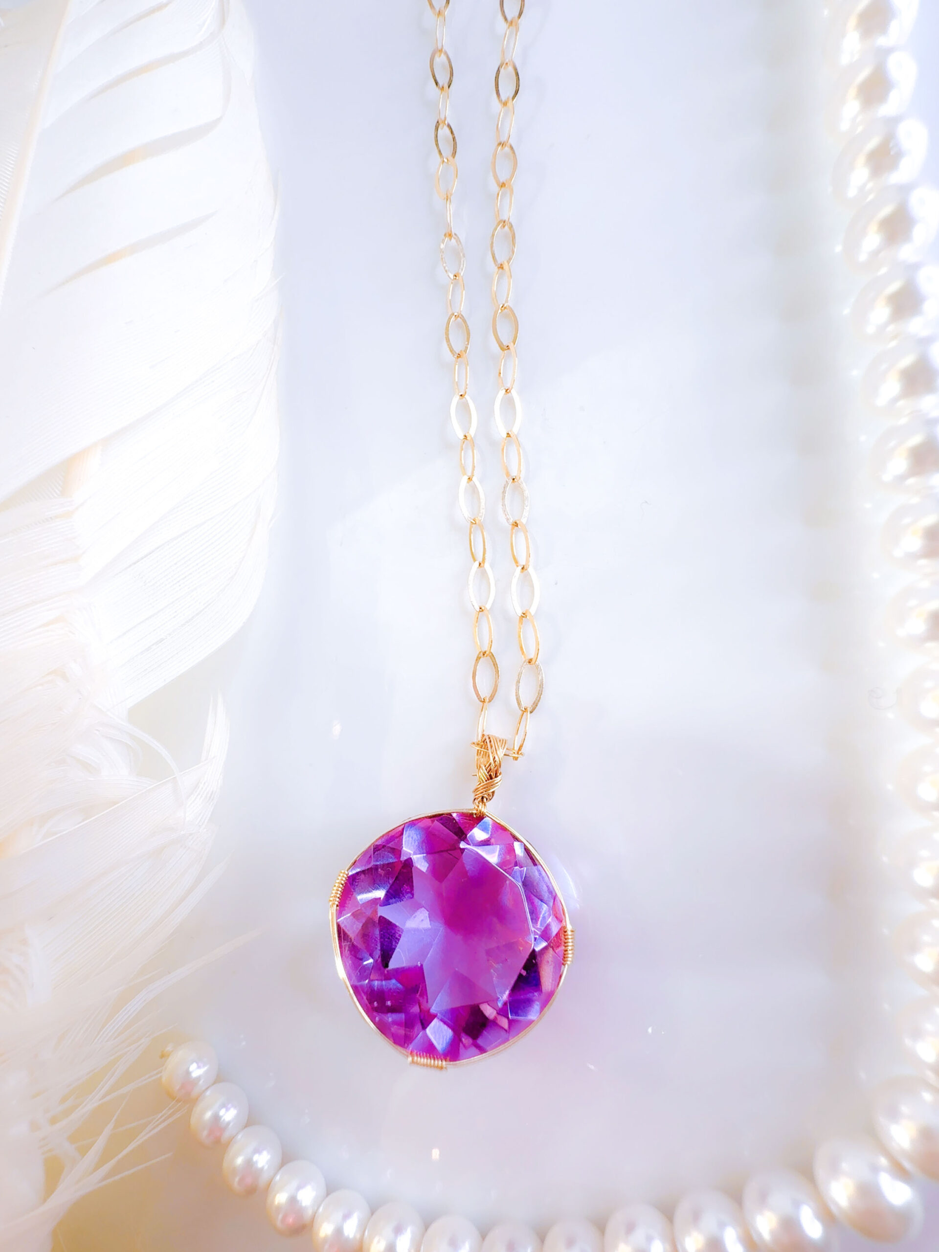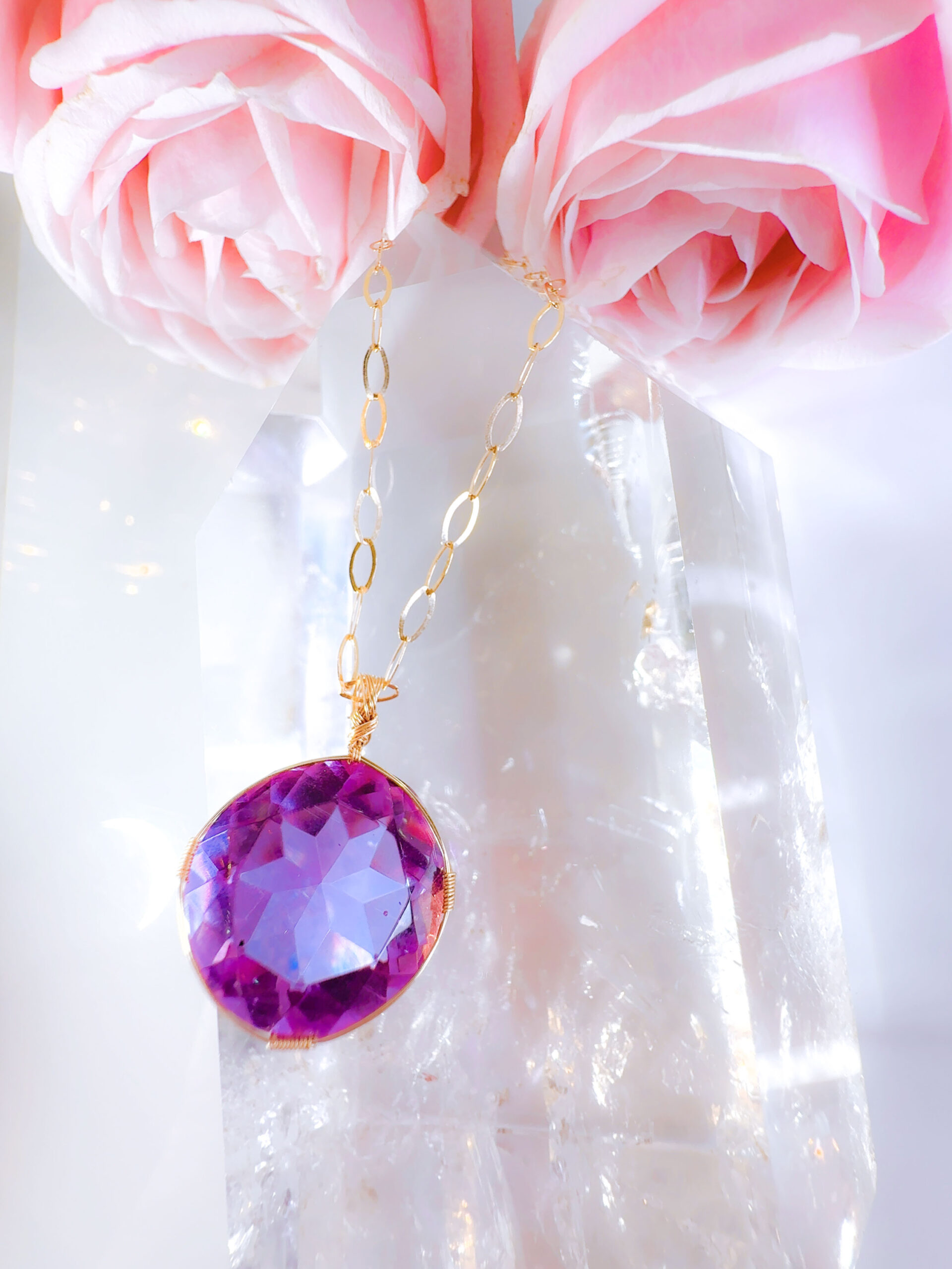 【PINK VIOLET TWIN FlAME】アンダラクリスタル宝石(28.5CT!/ピンクヴァイレット/ハイクオリティ!/ラウンドブリリアントカット)【ST.GERMAIN&LADY PORTIA】14KGF女神巻き®︎魔法のペンダント✴︎14KGFネックレス付き♪ 【TAURUS VENUS SUPER FULL MOON jewelry】【永遠美の秘宝/超超超希少! 1点もの】 (andara1308)