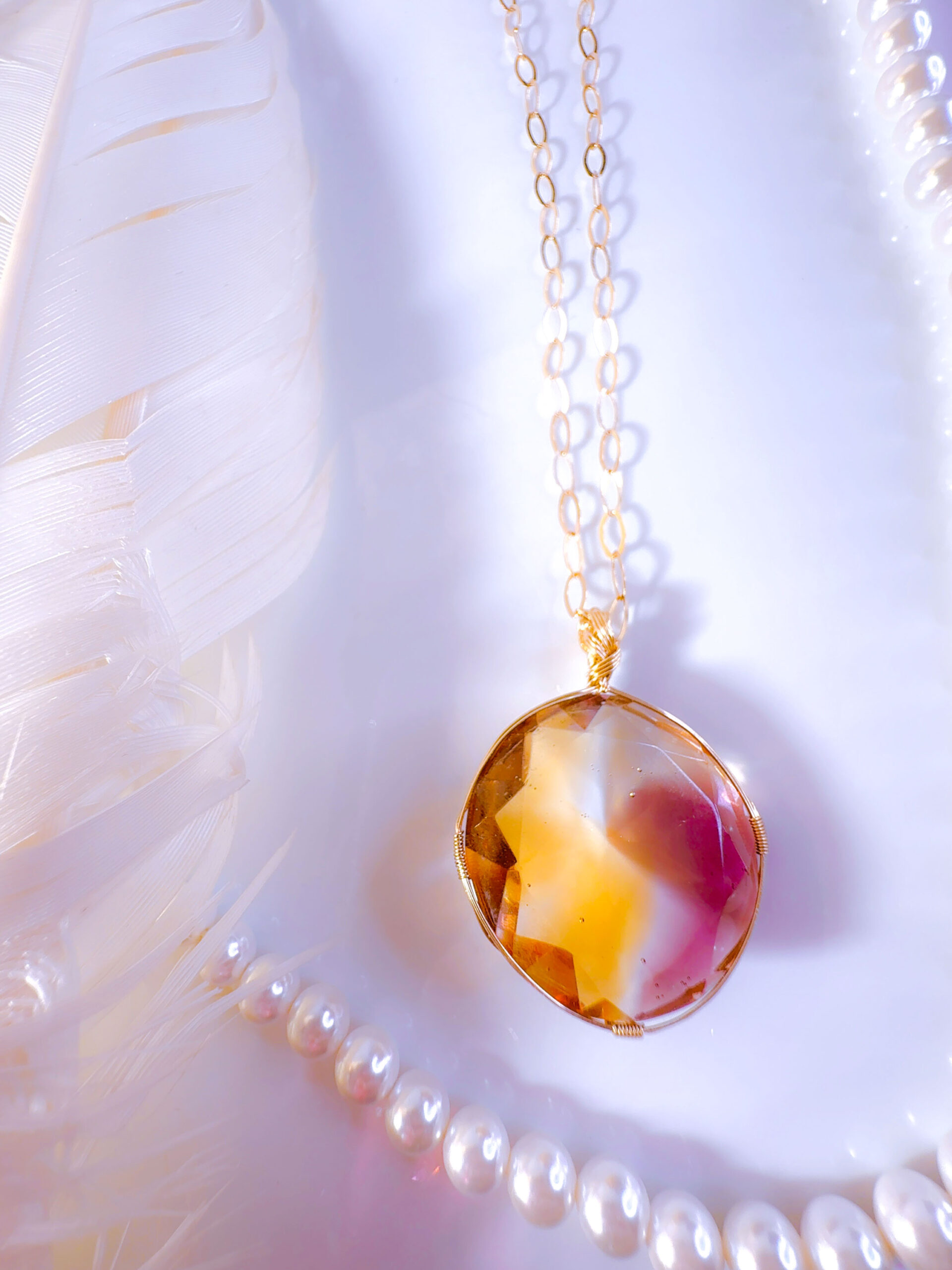 【SOUL PROMISE】アンダラクリスタル宝石(43CT!パープル/アンバーイエロー/クリアバイカラー/ラウンドブリリアントカット) 【ARCHANGEL ZADKIEL&RAPHAEL】14KGF女神巻き®︎魔法のペンダント✴︎14KGFネックレス付き♪ 【TAURUS VENUS SUPER FULL MOON jewelry】【永遠美の秘宝/超超超希少! 1点もの】 (andara1310)